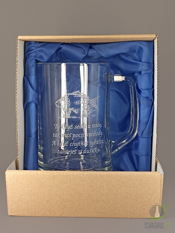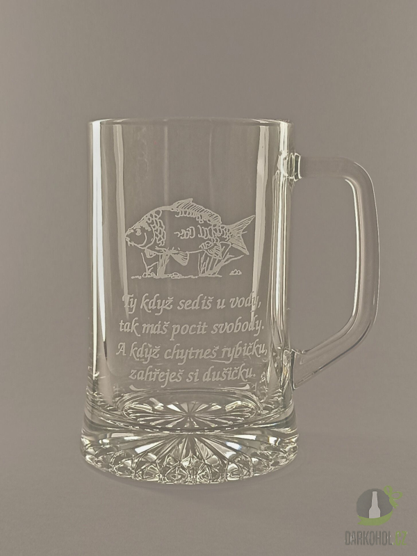 Ručně pískovaný skleněný půllitr ve tvaru půllitru s uchem o objemu 0,5 l s nápisem "Ty když sedíš u vody,tak máš pocit svobody.A když chytneš rybičku,zahřeješ si dušičku." s motivem kapra
