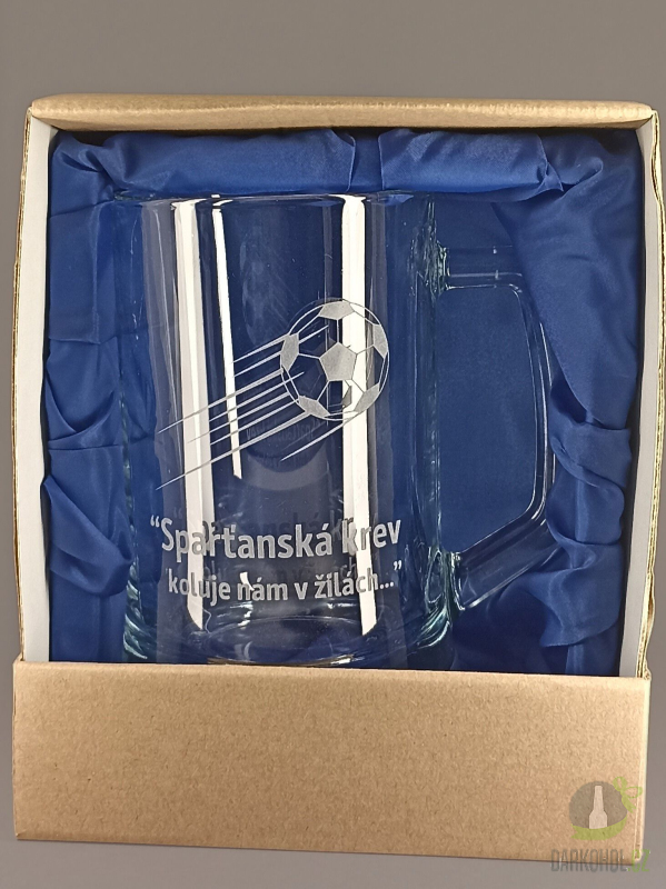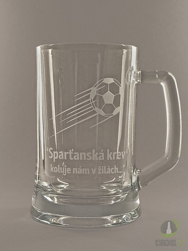 Ručně pískovaný skleněný půllitr ve tvaru půllitru s uchem o objemu 0,5 l s motivem Sparty
