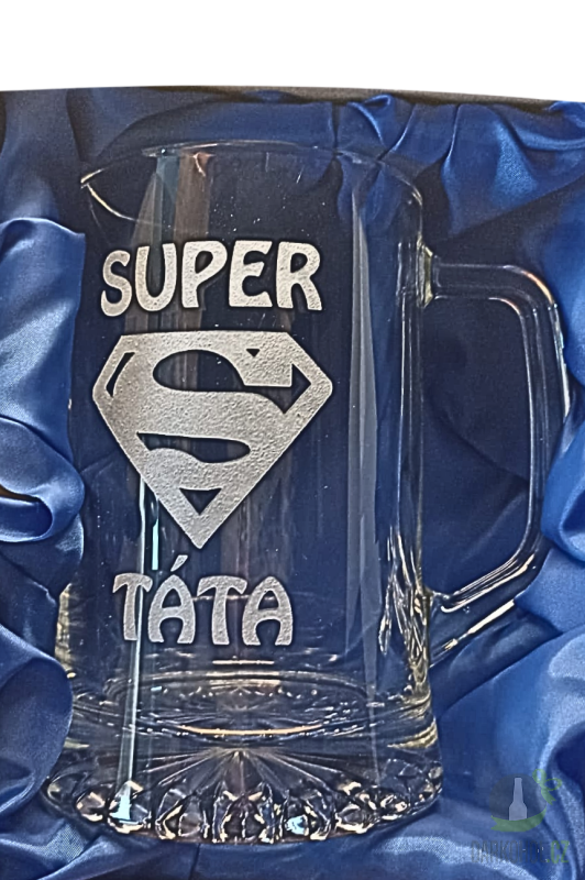 Ručně pískovaný skleněný půllitr ve tvaru půllitru s uchem o objemu 0,5 l s nápisem "Super táta s motivem Superman
