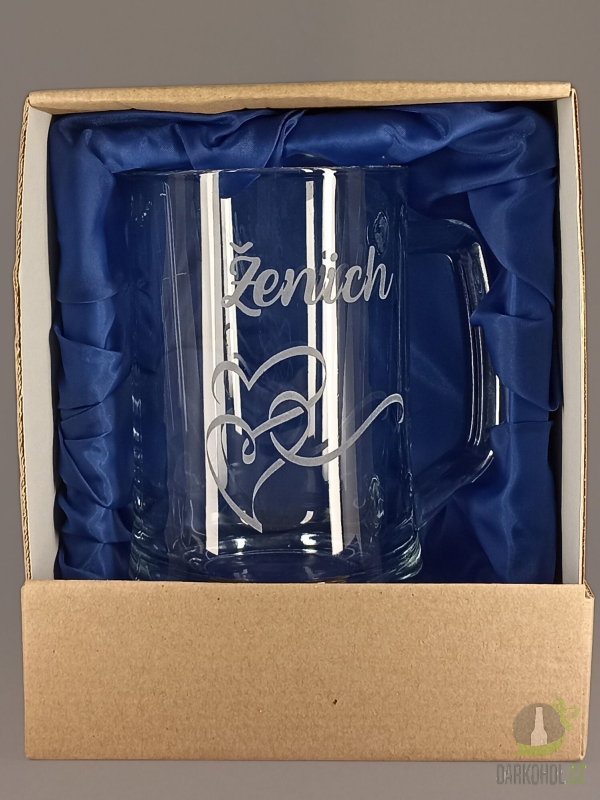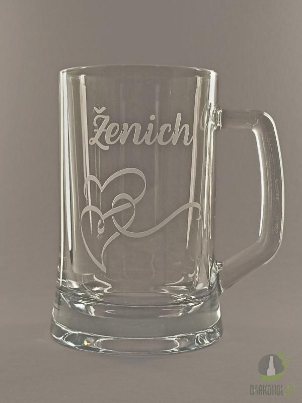 Ručně pískovaný skleněný půllitr ve tvaru půllitru s uchem o objemu 0,5 l s motivem Ženicha