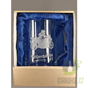 Ručně pískovaný skleněný půllitr ve tvaru půllitru s uchem o objemu 0,5 l s motivem Motorkářky