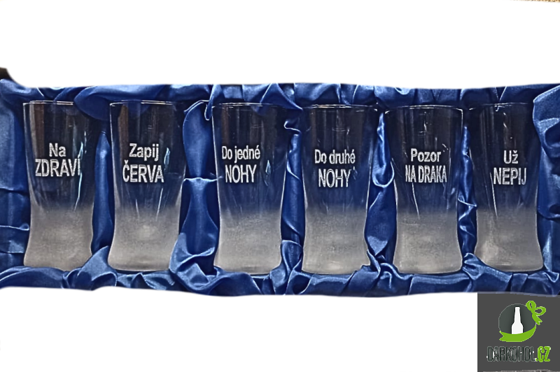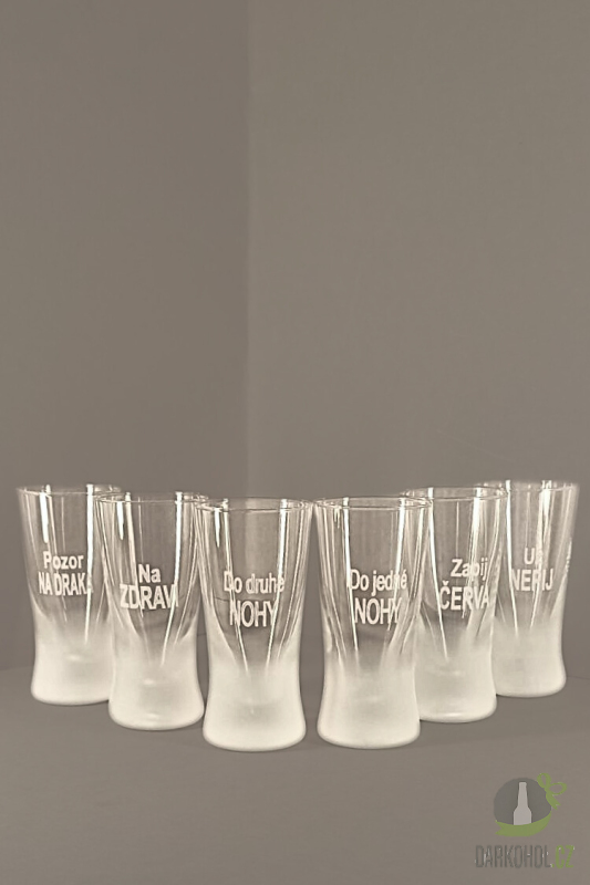 Ručně pískovaná skleněná sada panáků ve tvaru kónickém o objemu 0,04 l s nápisem "Na zdraví,do jedné nohy,do druhé nohy,zapij červa,pozor na draka,už nepij"
