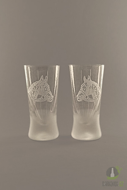 Ručně pískovaná skleněná sada panáků ve tvaru kónickém o objemu 0,05 l s motivem Hlavy koně