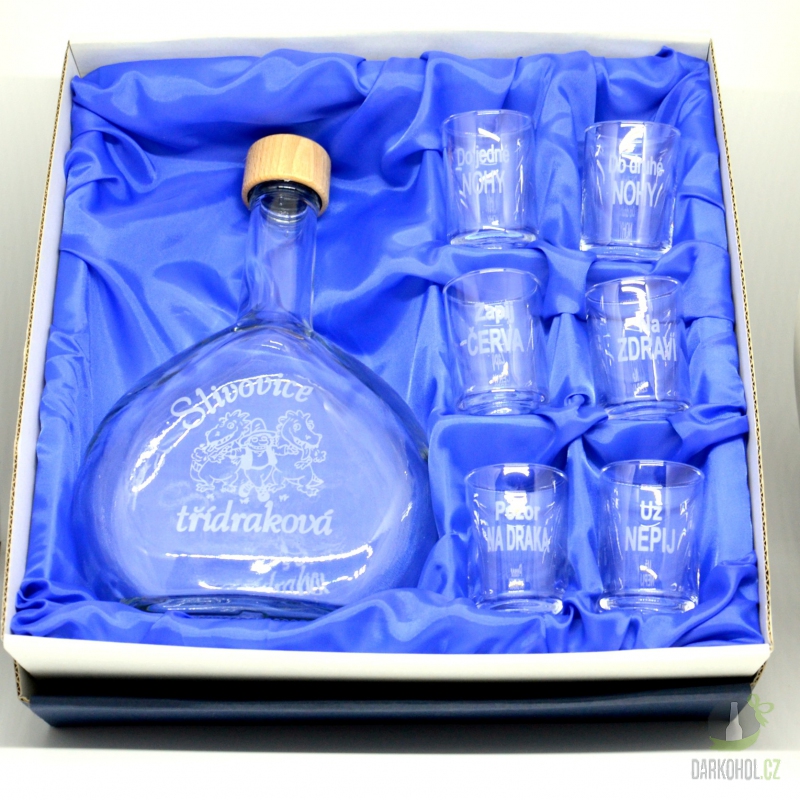 Ručně pískovaná skleněná sada láhve s panáky ve tvaru butylky o objemu 0,5 l s nápisem "Slivovice třídraková" s motivem Draka