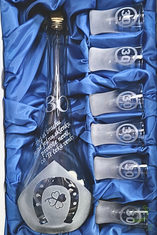 Ručně pískovaná skleněná sada lahve s panáky ve tvaru Goccia o objemu 0,5 l s nápisem "Dej si brachu ještě jednu sklenku,protože nevíš co tě čeká venku 30" s motivem Podkovy 30