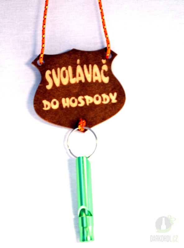 Dřevěná cedulka s gravírovaným nápisem "Svolávač do hospody" s píšťalkou.