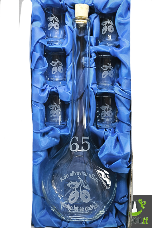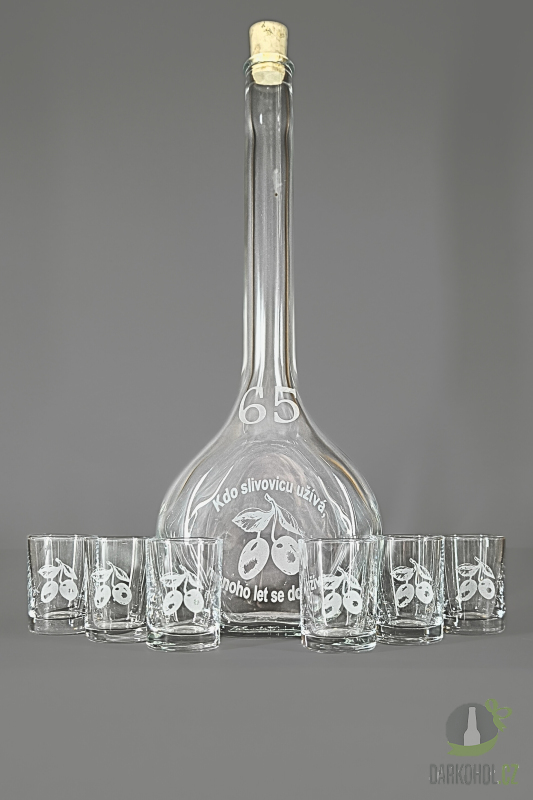 Ručně pískovaná skleněná sada láhve s panáky ve tvaru Contesa o objemu 0,5 l s nápisem "Kdo slivovicu užívá mnoho let se dožívá" s motivem 65