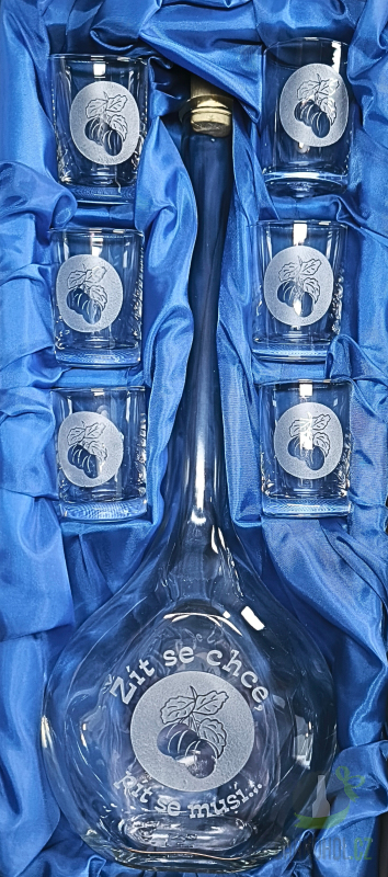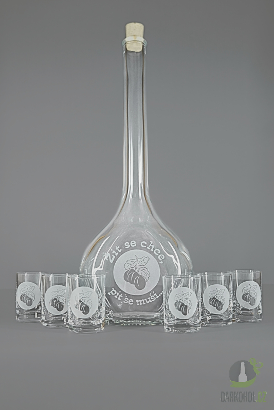 Ručně pískovaná skleněná sada láhve s panáky ve tvaru Contesa o objemu 0,5 l s nápisem "Žít se chce pít se musí" s motivem švestek